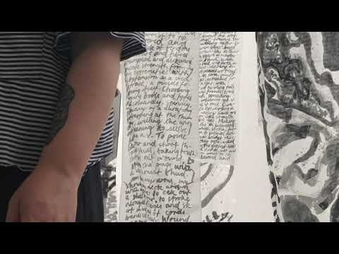 Utilising investigations and experiences of a continued interest in language, mark making and the land, this body of work considers how these three strands have intrinsic relationships with each other. Using writing and mark making interchangeably, I have initiated a consideration of the mimesis between the two, and how this vocabulary is conceived, adapted and used. Borrowing and familiarising myself with a lost topographical language and activating it from a personal relationship has produced an insistence on unravelling the bonds between the physicality of these terms and the act of mark making. I have made work generated by tracing the body language shared in these words, using muscle memory and recall to create a swinging pendulum between the terms and my own marks. Creating a lexicon of flicks, twists, turns, hesitations, pushes, drags, pauses, holds, has created a backbone for navigating my interests in the natural world and translating the sensitivity felt when experiencing a landscape. Through large scale ink paintings on silk and multi-media surface exploration, I aim to physically engage with the tactile reality of the natural world in both an intimate and ubiquitous manner. Working alongside the larger works, using my own poetry/prose has allowed me to use the back and forth between my words and marks to break down, play and expand on ideas of legibility and transcribing. Considerations regarding gathering, offering, arranging, finding kinship, adapting, borrowing, transposing, negotiating, composing have become acts of ritual that amplify intuitiveness. The work is visually reduced into simple formats which can be received in fluid environments and an engagement with repetition results in an incremental gathering of non-quantifiable data regarding human interaction with landscape. I wish to make work which sits between research enquiry, poetic sensibility and material curiosity.